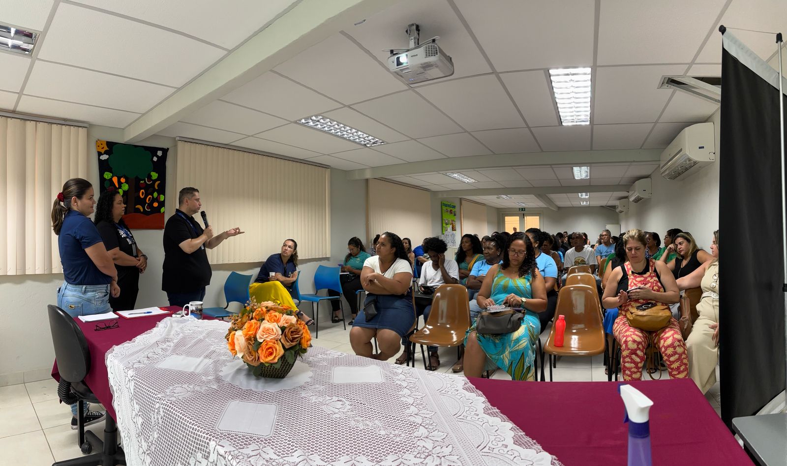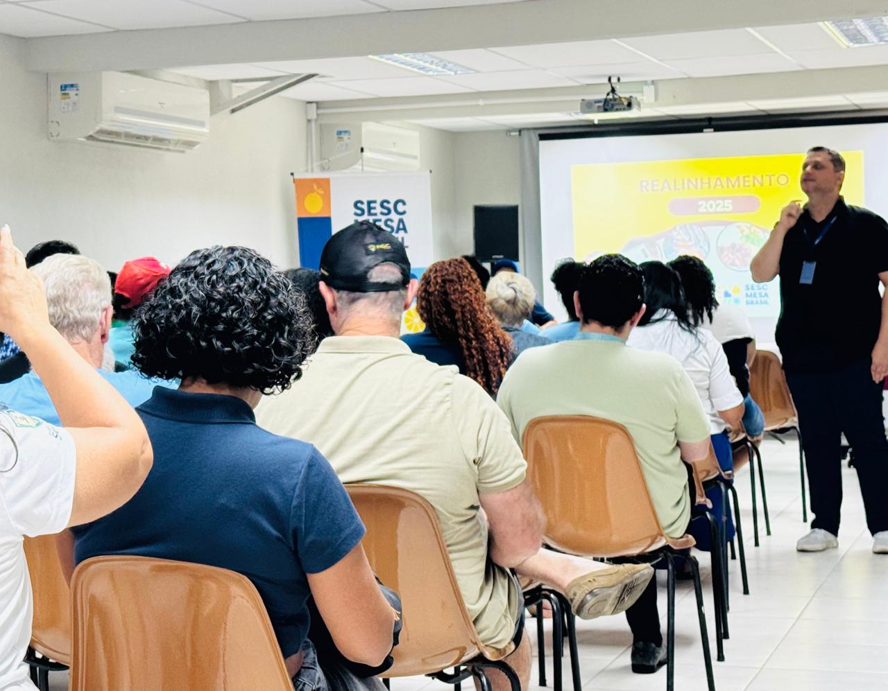 A equipe de Nutrição e Assistência do Sesc Mesa Brasil conduziu a conversa, informando e tirando dúvidas sobre a distribuição de alimentos e o atendimento diário do programa.