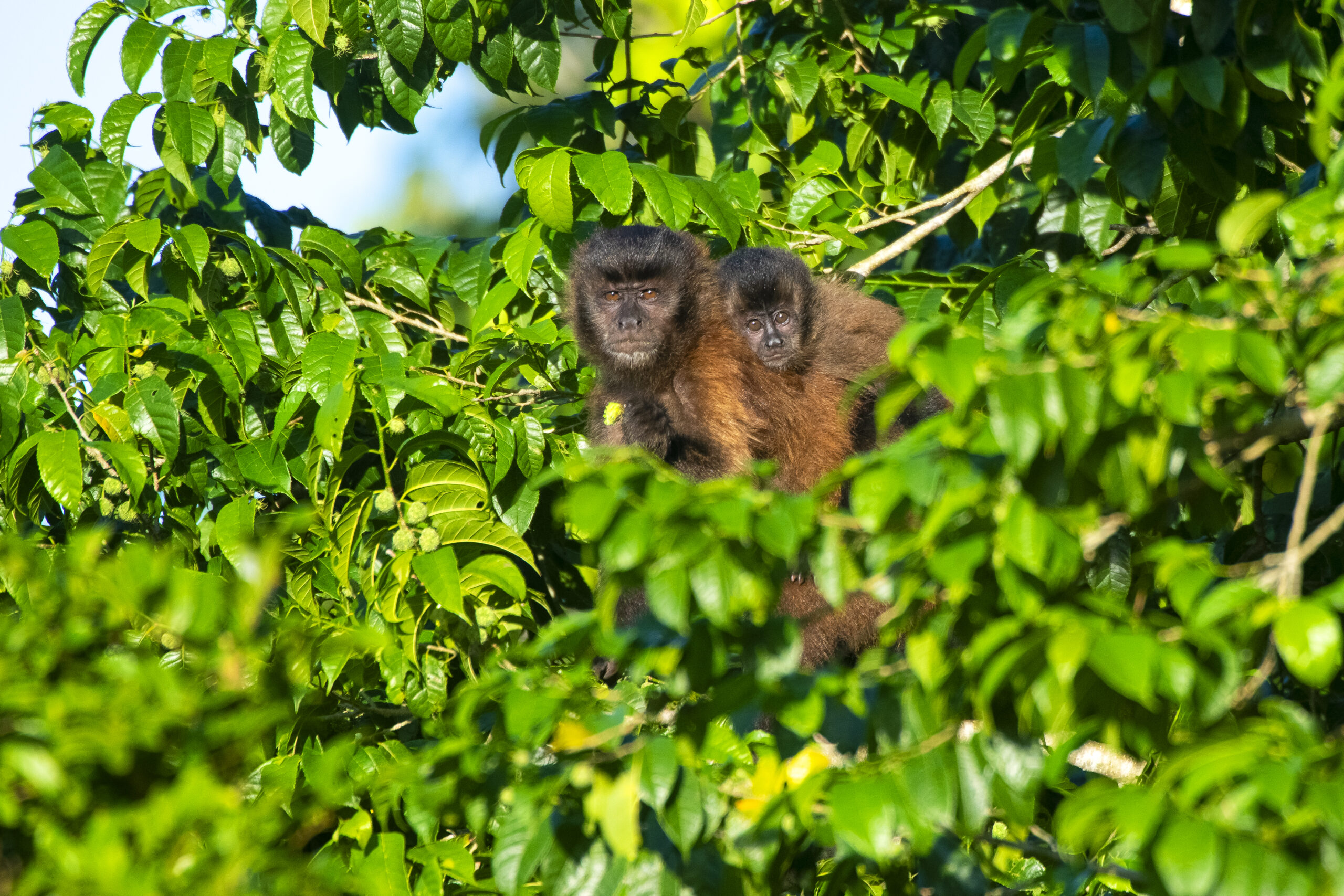 Família de Macaco-prego-preto (Sapajus nigritus) alimentando-se ao lado de um dos locais de hospedagem do SESC PRAIA FORMOSA | Foto: Leonardo Merçon/Instituto Últimos Refúgios