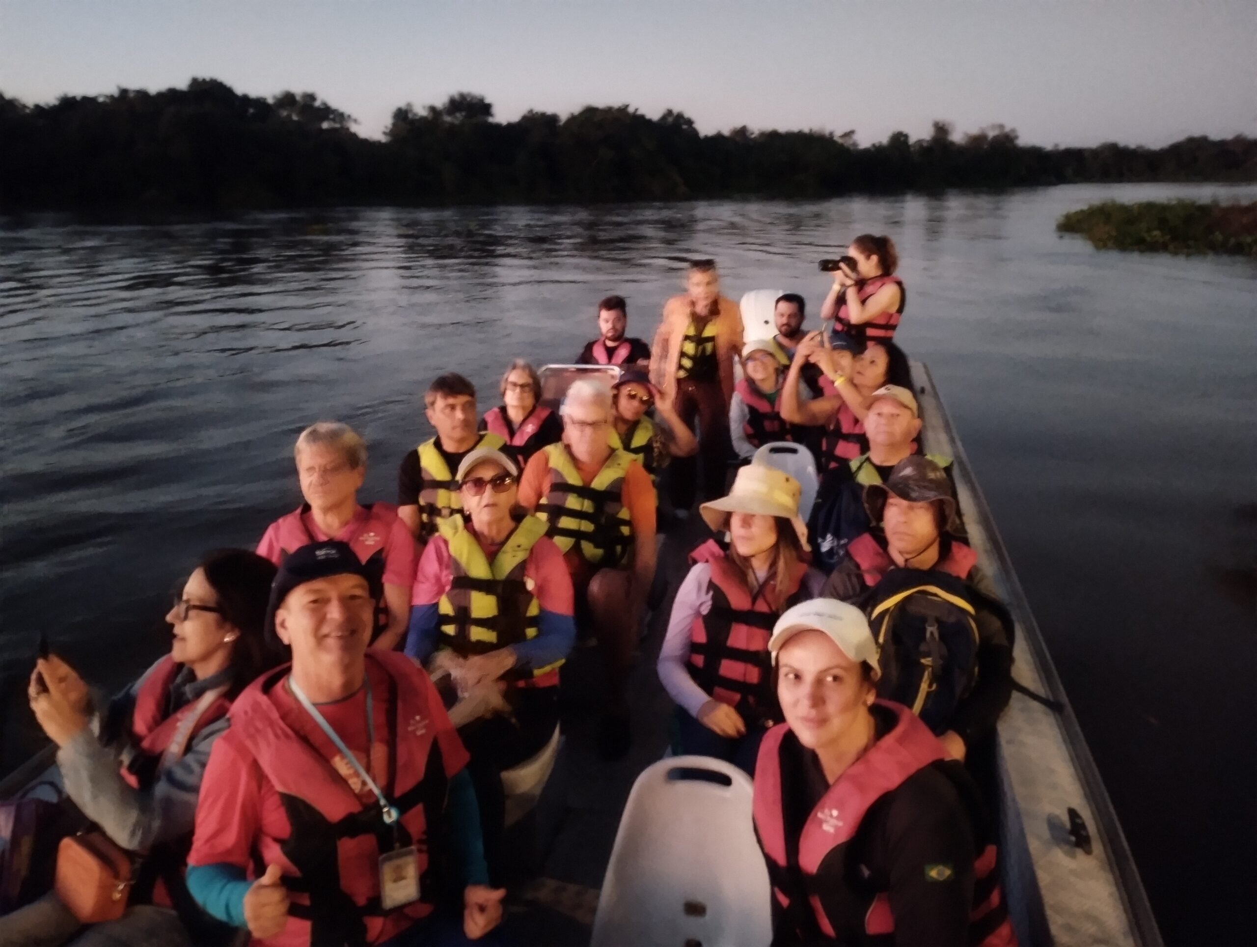 Entre os destaques da programação, o passeio “O Despertar no Rio Cuiabá” encantou os participantes logo ao amanhecer do dia 15, com a beleza serena do sol nascendo entre as águas e o som da fauna pantaneira acordando com o dia. Já na noite do dia 16, o grupo participou da Focagem Fluvial, uma experiência noturna que revela a vida selvagem do Pantanal sob outra perspectiva — uma verdadeira aula sobre os hábitos dos animais após o pôr do sol.