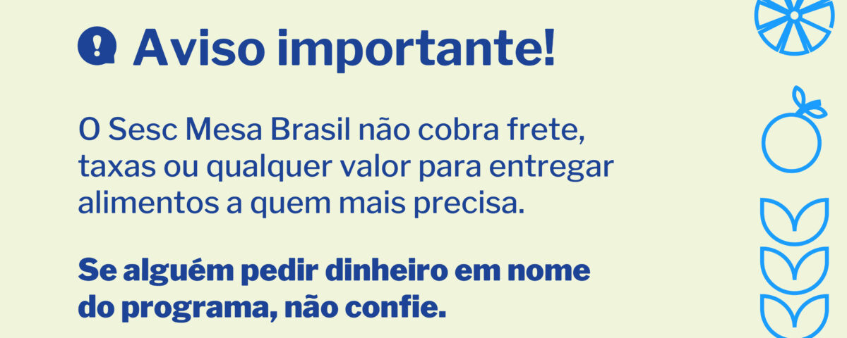 Reforçamos que nenhum representante do Mesa Brasil está autorizado a pedir dinheiro ou qualquer vantagem financeira para efetuar entregas ou intermediar processos. Se alguém pedir dinheiro em nome do programa, não confie.