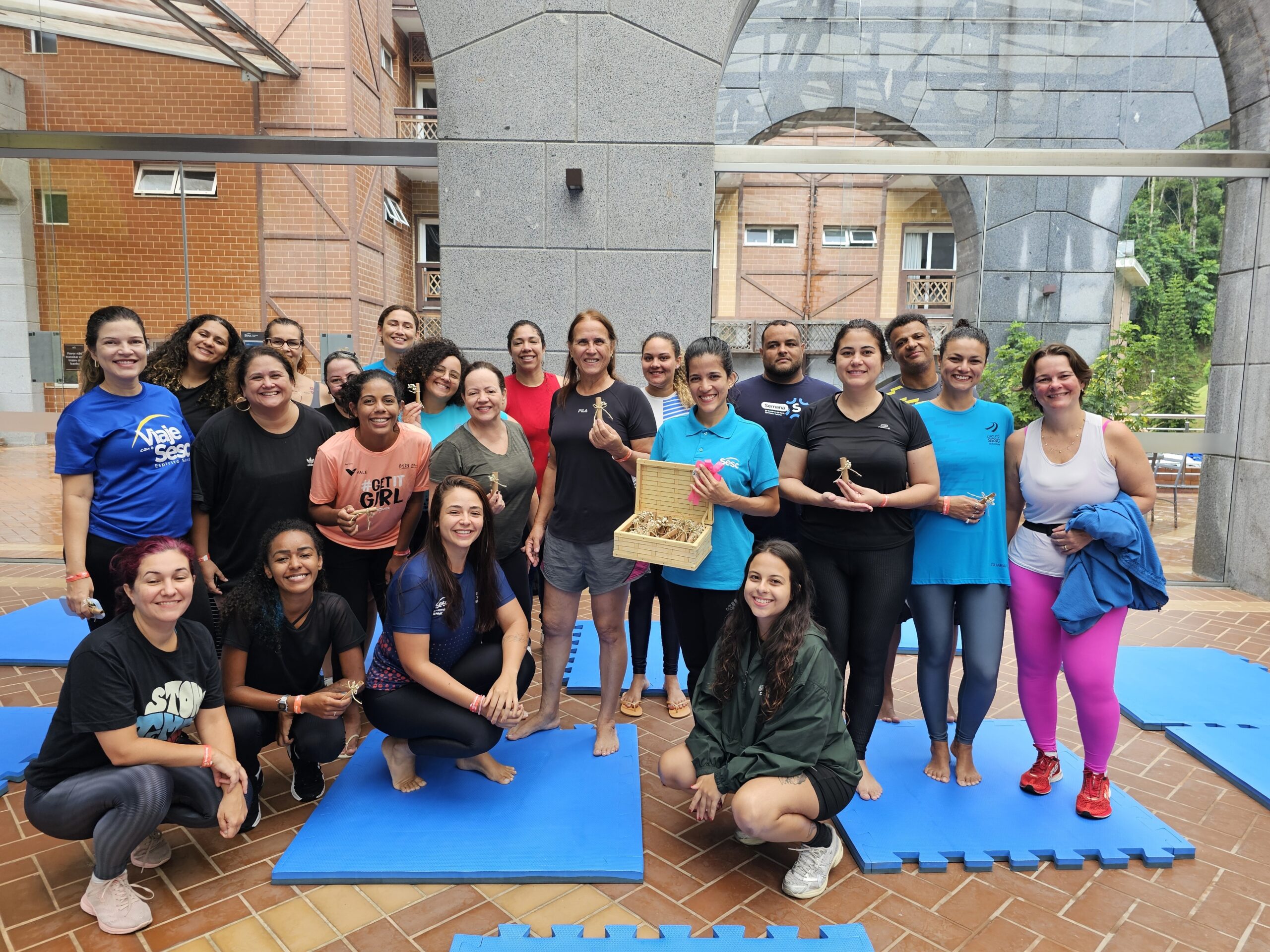 Uma das novidades apresentadas no IX Encontro de Resultados foi a ativação da recreação nos hotéis da rede Sesc-ES. Os participantes vivenciaram atividades de alongamento, trilha e yoga.