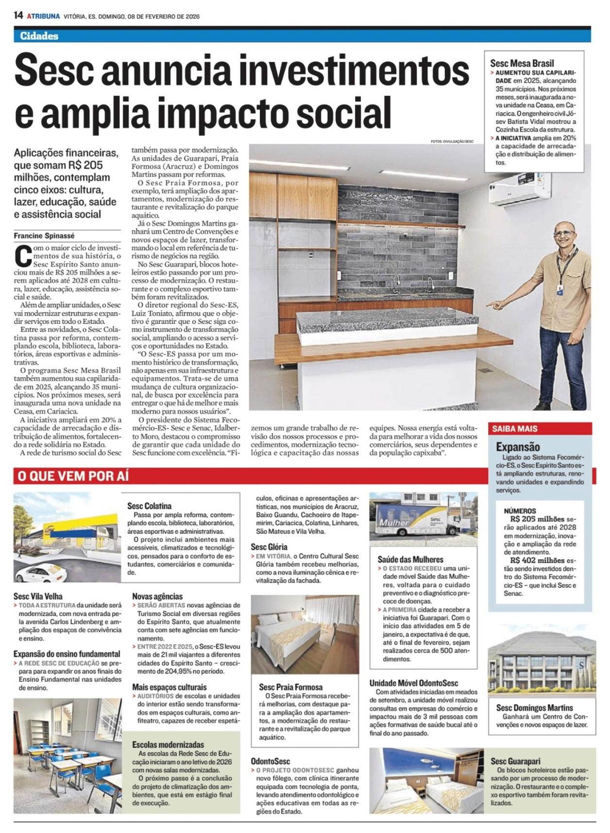 O Sesc-ES foi destaque na edição do último domingo, dia 08 de fevereiro, no Jornal A Tribuna. A edição reforça o maior ciclo de investimentos da história da instituição: mais de R$ 205 milhões até 2028.
