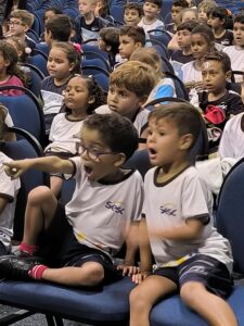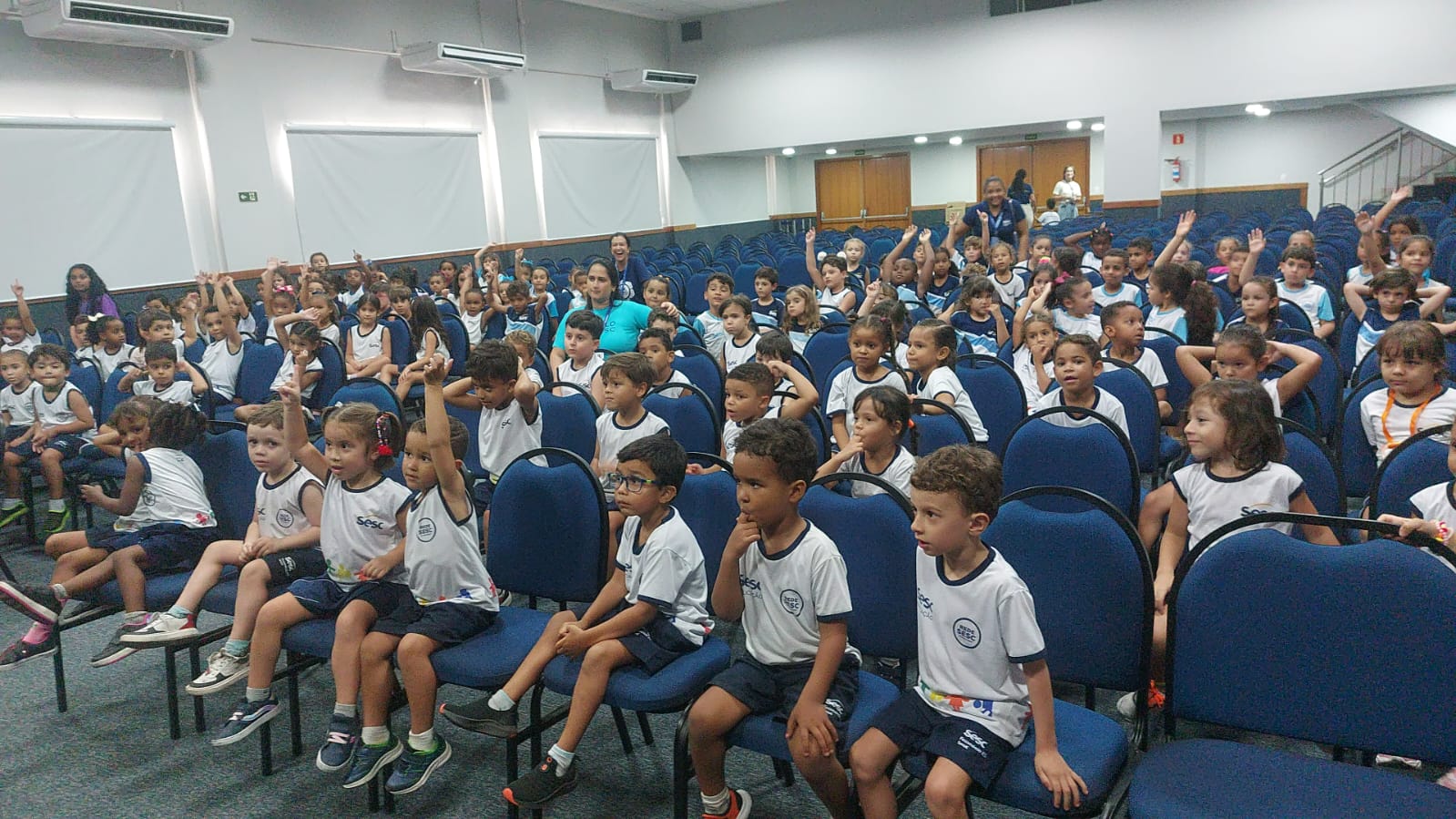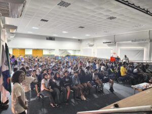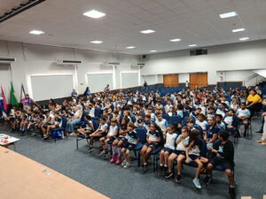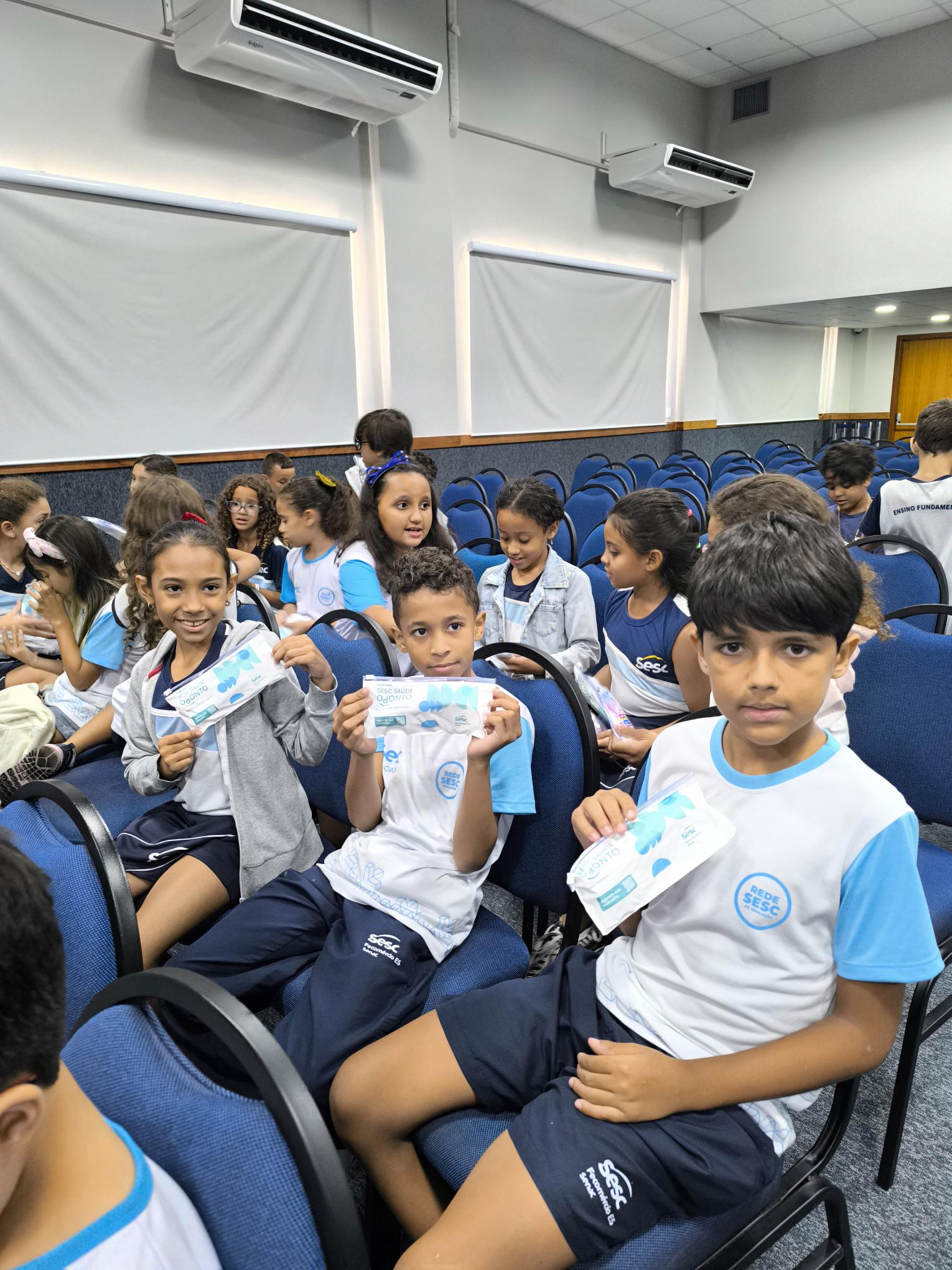 nsecutivas, garantindo que todas as turmas da escola pudessem participar da atividade. Mesmo com o grande número de estudantes, a organização do fluxo no auditório permitiu que todos recebessem as orientações e os materiais de forma adequada.