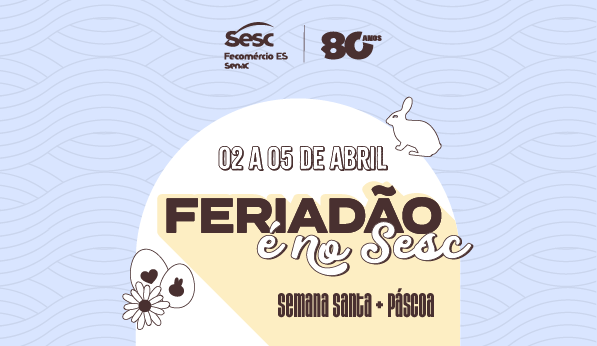 10/03/2026 10/03/2026Categorias Lazer, Turismo e EventosFeriadão é no Sesc: pacote especial de Páscoa terá recreação temática e hospedagem nos hotéis do ESO feriadão de Páscoa pode ser a oportunidade ideal para desacelerar e aproveitar momentos especiais em família. Pensando nisso, o Sesc Espírito Santo preparou um pacote […]