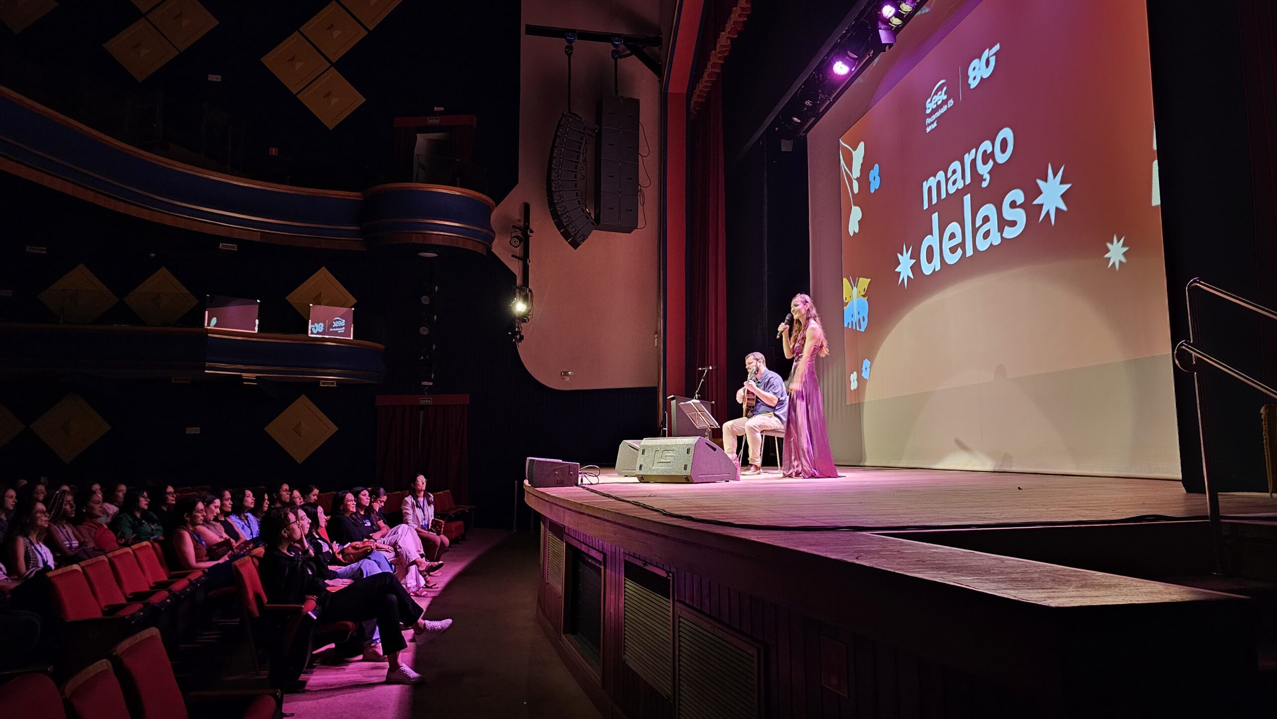 Um dos pontos altos da programação ocorreu no Centro Cultural Sesc Glória, onde as colaboradoras vivenciaram a grandiosidade do Teatro Glória durante uma apresentação musical exclusiva da artista Ekaterina Bessmertnova, que preencheu o palco com sambas de grandes intérpretes brasileiras, como Clara Nunes, Alcione, Elis Regina e Gal Costa.