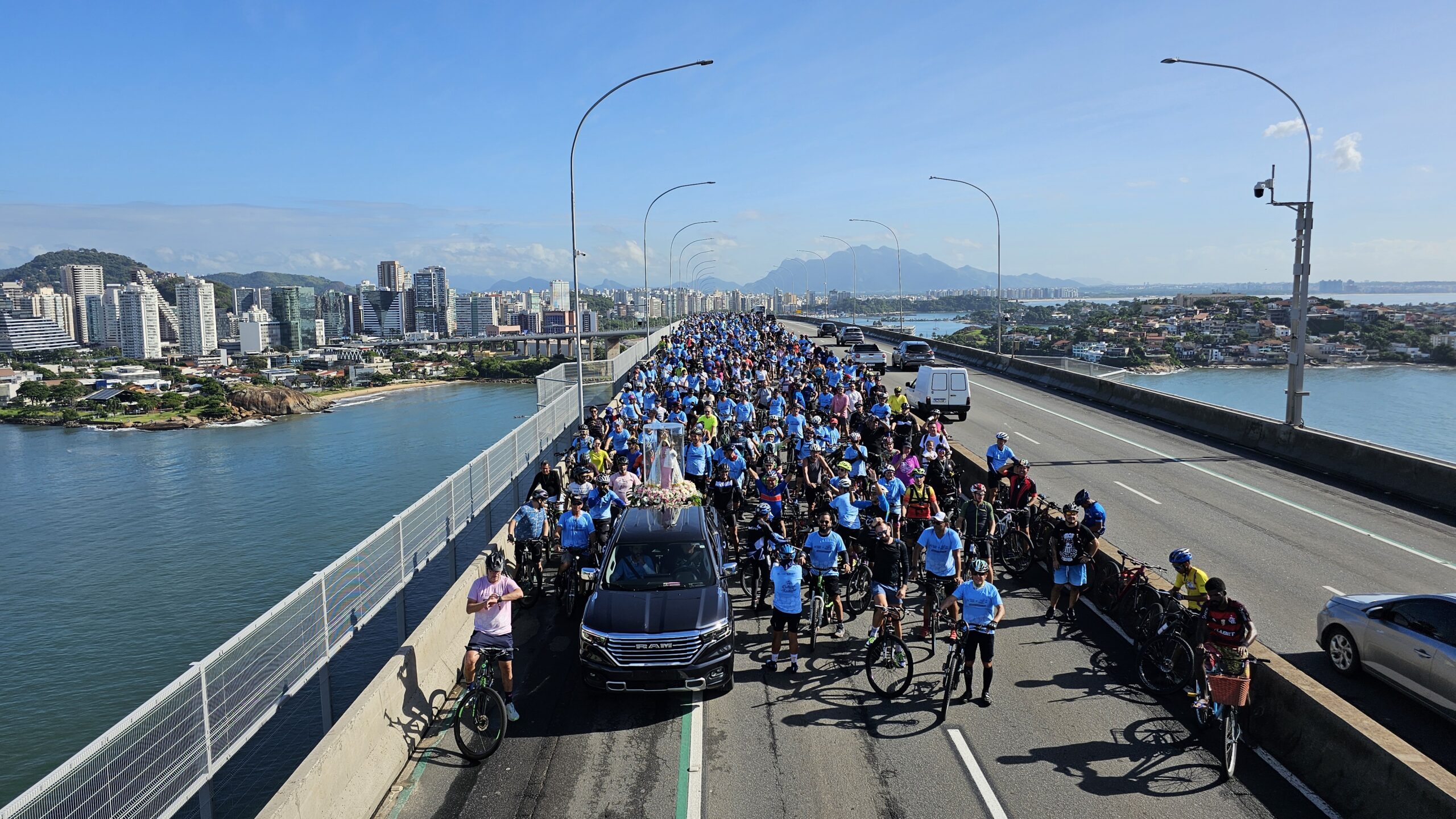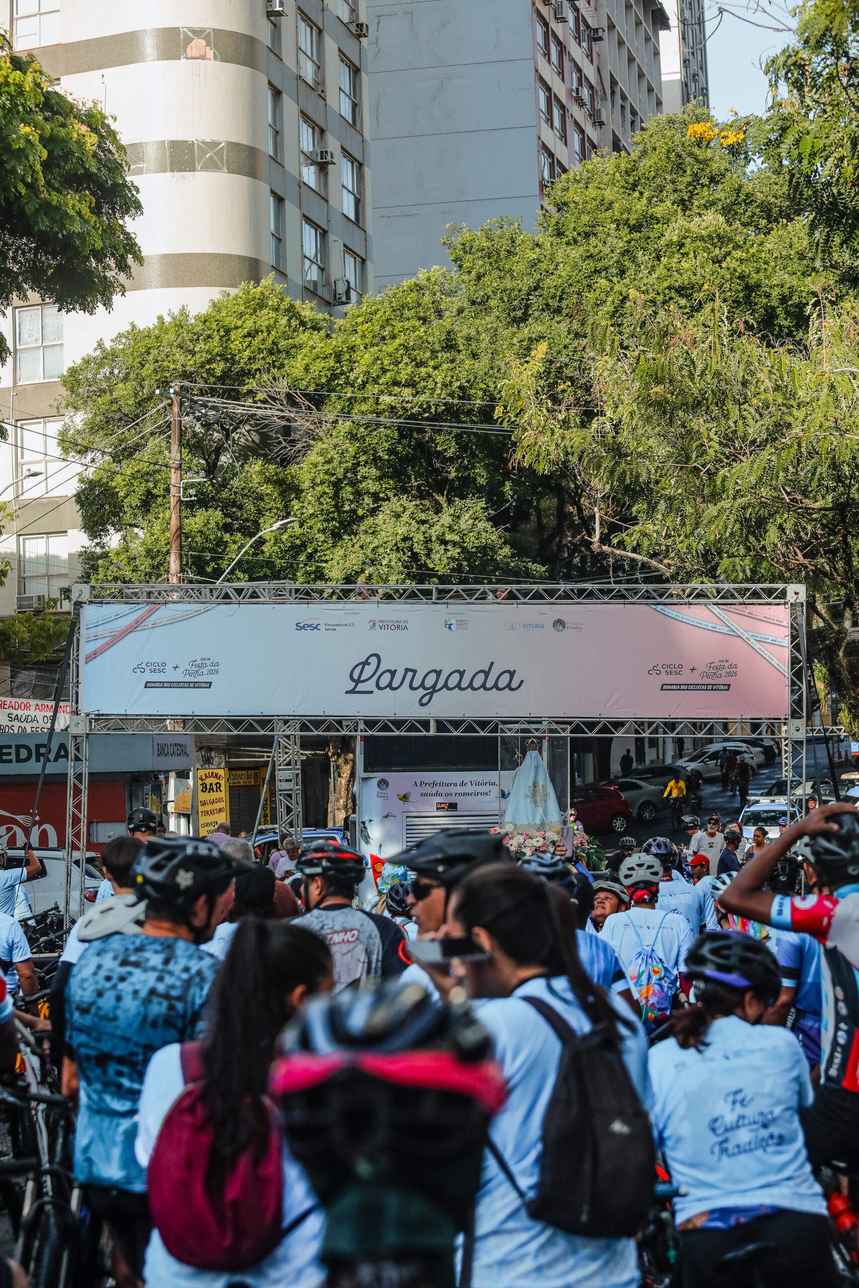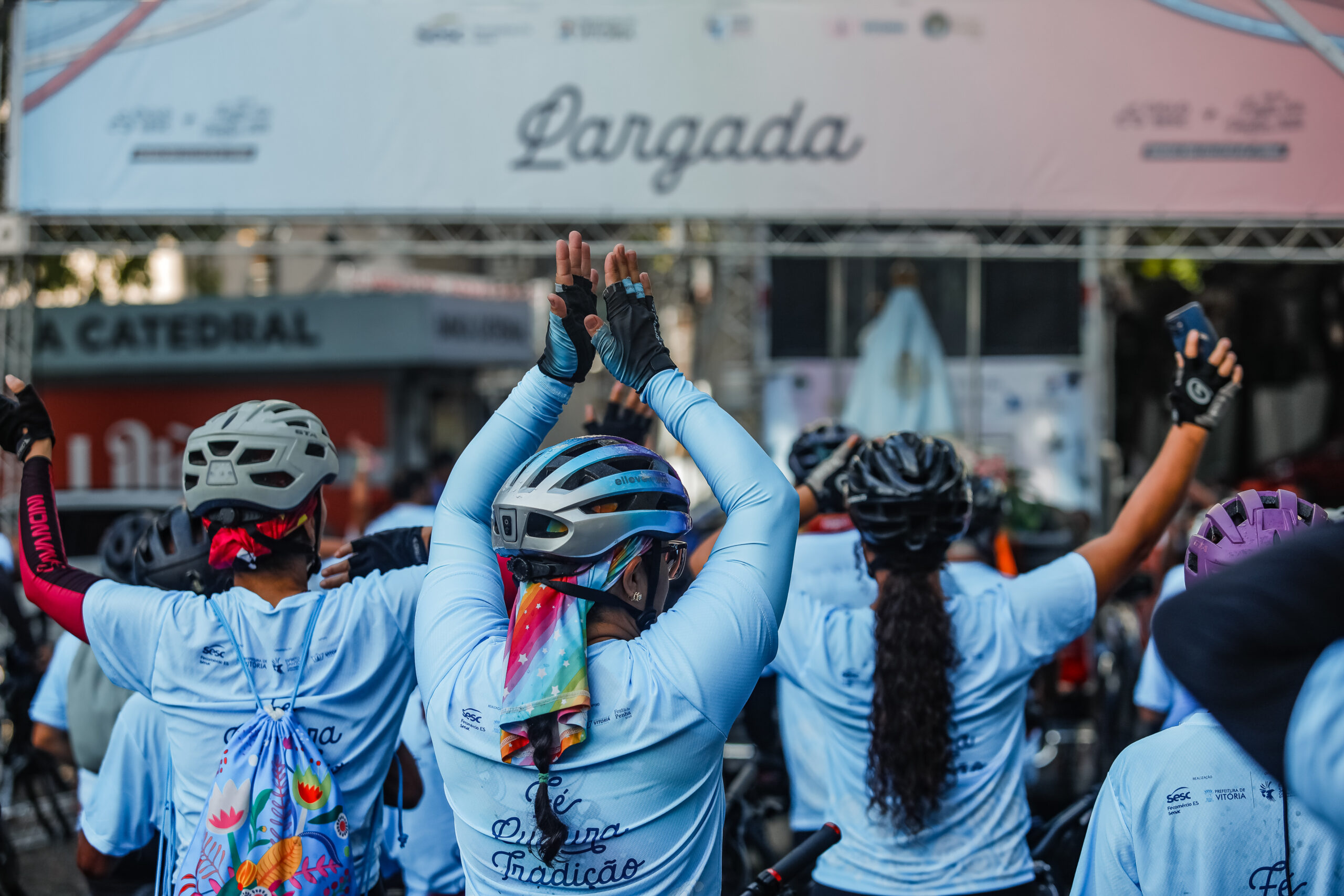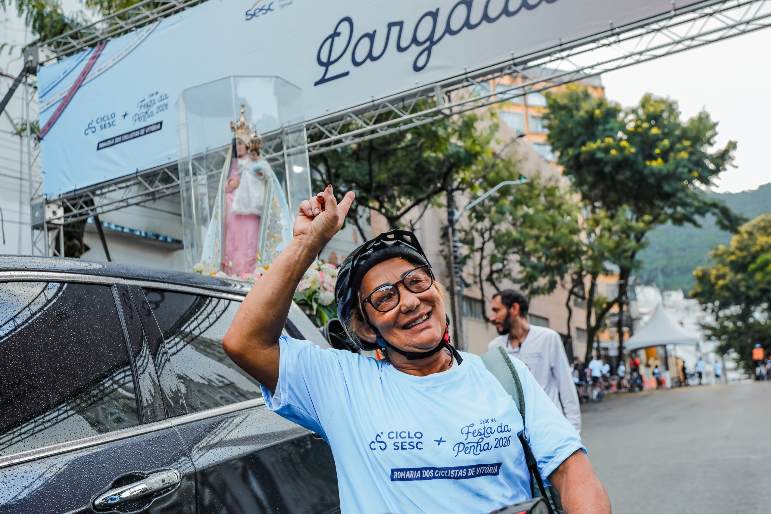 A integração do CicloSesc à tradicional Romaria dos Ciclistas de Vitória transformou o trajeto de 10 quilômetros entre a Catedral Metropolitana e a Prainha em um espetáculo visual. Os participantes coloriram a Terceira Ponte de azul, unindo a prática esportiva à devoção mariana.