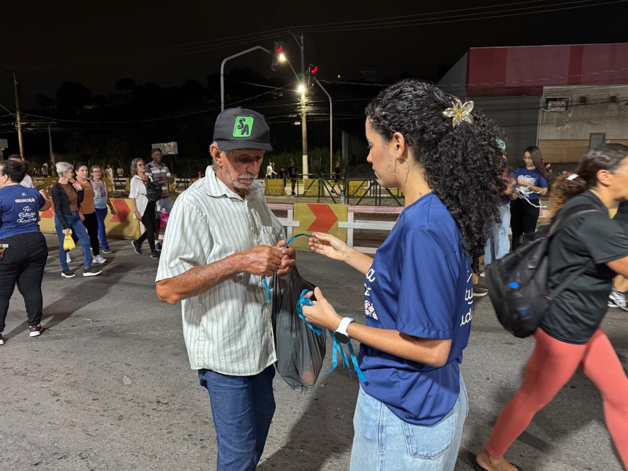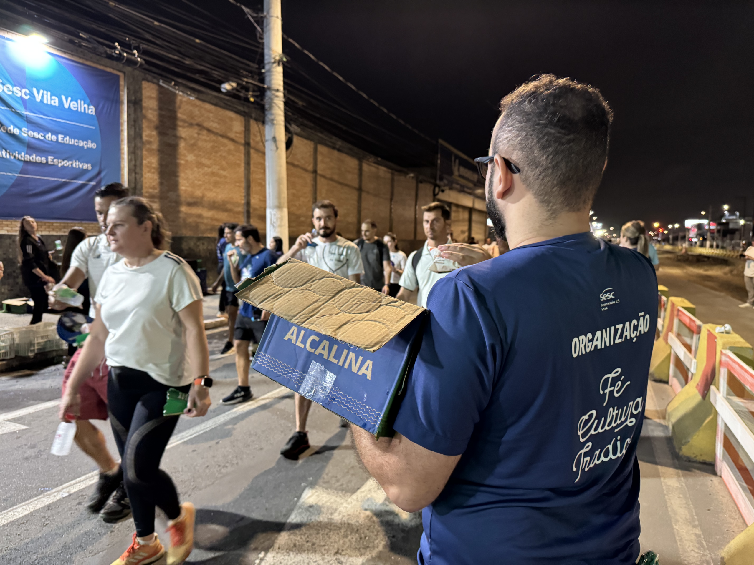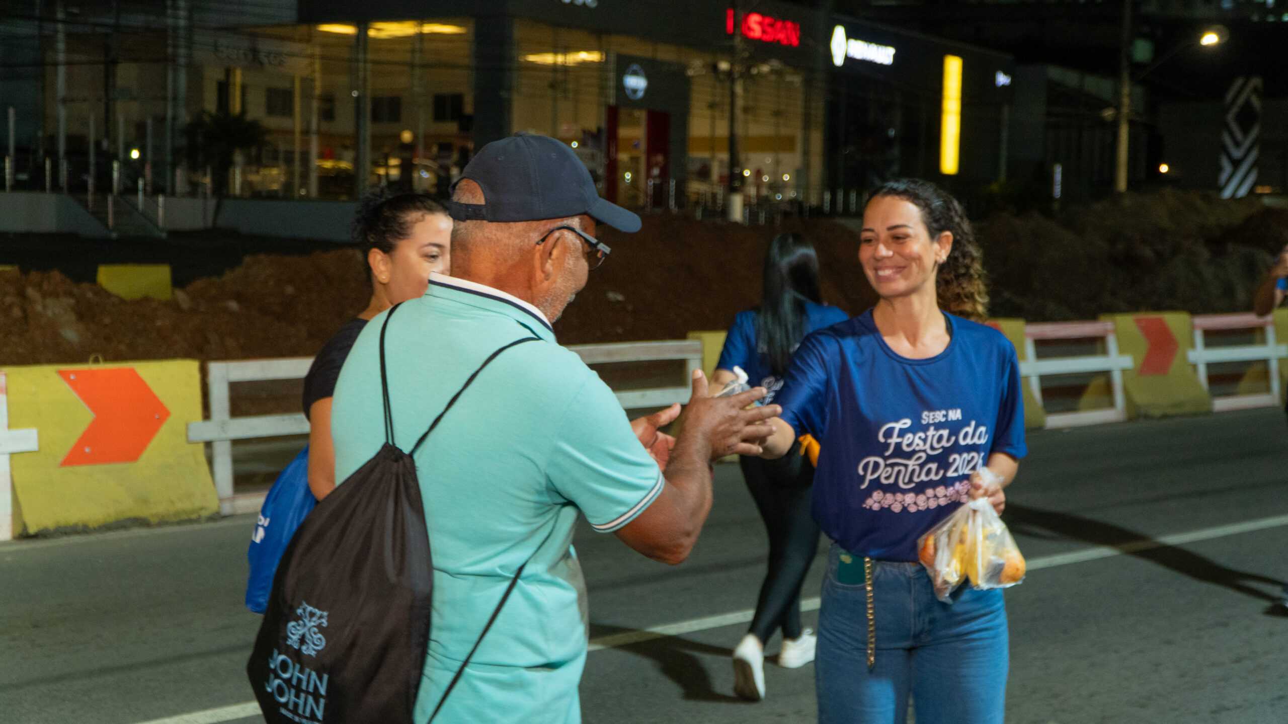 Como forma de apoiar os romeiros durante a caminhada, foram entregues kits lanche, bananas e copos de água para os romeiros, em uma ação mobilizada pelas Gerências de Saúde e Assistência Social do Sesc-ES, reforçando o compromisso da instituição com a promoção da saúde e do bem-estar.