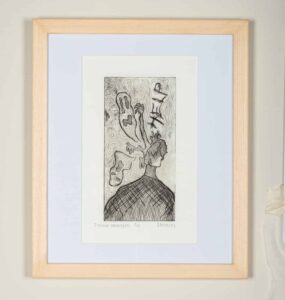 Seus trabalhos são auto-representacionais e abordam estados de ânimo e introspecção. A face, quando oculta, reforça a atmosfera de mistério e recolhimento. Da cabeça da personagem emergem formas que simbolizam pensamentos intrusivos e indesejados, representações visuais de conflitos internos que habitam o imaginário e a subjetividade da artista. Nesse sentido, a gravura não apenas materializa aspectos da melancolia vivenciada cotidianamente pela artista, mas também convida o público a refletir sobre a potência da arte como meio de expressão sensível e de compartilhamento de experiências humanas complexas.